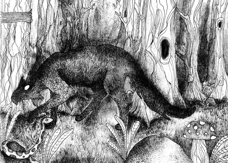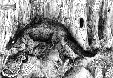 Well, I see some hands reaching out, another hand dropping an egg that falls down onto the hill where the animal is standing and sniffing. For me, it's a fox. The hill is behind the house where the family lives.